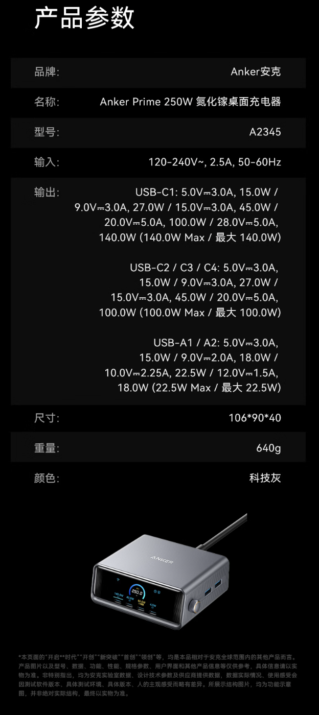 该产品支持 SCP、PPS、PD、QC、UFCS 等协议,其中 USB-C1 接口支持 140W 输出,USB-C2/3/4 接口支持 100W 输出,USB-A1/2 支持 22.5W 输出。